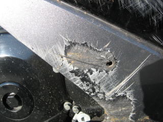 14:09 気持ちを落ち着かせ、あらためて、右側のカウルを見ると、見事に削れています。 (T_T) これが現実だぁ。 |