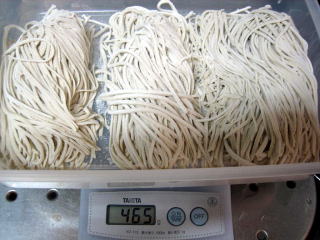 水は最初45%位入れましたが、不足気味だったので、48%まで加水しました。 最終的には、やや不足気味で、袋に書いてあるように50%前後は入りそうです。 そんなこともあり、麺体の端部はややひび割れ気味で、細打ちにするほど延ばすことが出来ませんでした。 この白樺、以前打ったときは更級粉に近い様な印象で、細打ちにした方が良かったと記憶しています。 |