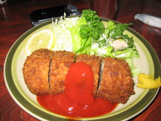 自分が頼んだ、ヒレカツ定食。 パッと見大したことなさそうですが、断面を見ると(カーソルを写真のところに持っていくと)この通り、ボリューム満点、これでもの足らないという人はいないでしょう。 肉も軟らかく、ジューシーで美味しい。 |