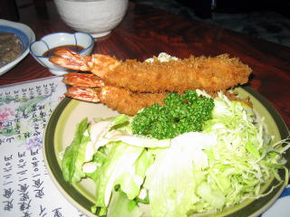 なべちゃんが注文した、かしわくら名物料理のひとつ『えびふりゃ』 写真ではイマイチ大きさがわかりませんが、巨大です。 エビフライにして、この大きさですから、頭があったら30cm超級です。 ここかしわくらは外房の海の幸をメインとした刺身・魚料理ですが、今回は寒すぎて刺身定食を頼む人はいませんでした。 でも、かしわくらの刺身・魚料理もお薦めです。 |
