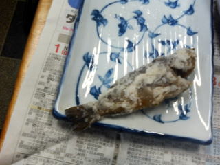 出来上がり。 (相変わらず、写真を撮るのが下手な自分です) 鯵はフライではなく、片栗粉を使った”唐揚げ”です。 揚げたてに、塩をパラパラっと振ったシンプルなもの。 素材の味がそのまま出てきます。 二度揚げしてあるので、頭ごと骨まで全部食べることが出来ます。 さっそく、いただきます。 「うまーいです」 鯵が持っているクセが無く、白身魚の様にさっぱりとした上品な味です。 (まだまだ、新しいからでしょうか) これならば、フライより唐揚げの方が良いですね。 |