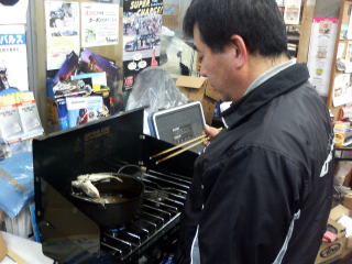 釣りに行った翌日にお誘いの電話をもらったのですが、残念ながら新年会を入れてしまい、中1日置いたやや鮮度の落ちた状態で食材が登場しました。 (と言っても、魚屋に並んでいるものより、遙かに新鮮に見えます) 早速、店の中にアウトドア用のレンジをセットし、調理を始めるアイスエイジさんです。 |