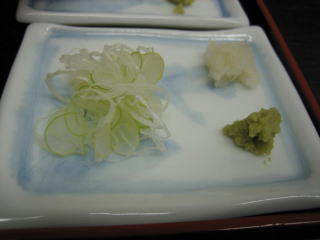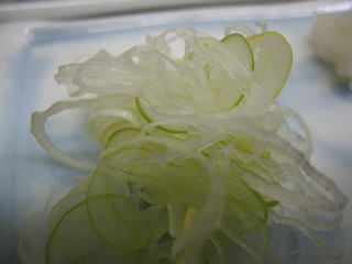 薬味のネギ。 薄〜く刻んであります。良い仕事をしていますねぇ。 (当たり前ですね。日本一と言われる蕎麦屋さんの一つですから・・・) |