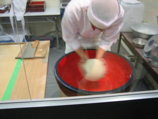 店の横のブースでは、蕎麦打ちを実演していました。 蕎麦をこねているのは、高橋邦彦氏ではなく、お弟子さん(?)でした。 おそらく、2kgくらいをの玉をこねていると思いますが、その早いこと早いこと。 あっと言うも間にこね上げてしまいます。 |