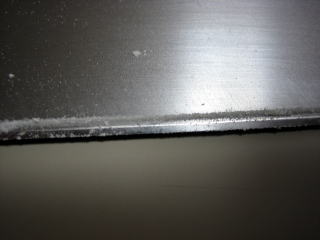 おまけ 自分で打った蕎麦包丁の刃先の写真ですが、ある程度蕎麦を切ると、刃先に蕎麦が付着しました。 今まで、これは蕎麦に入れる水の量が多すぎるために、べたついて、刃にくっつくと思っていました。(多加水だと思っていました) 今回、高橋氏のそば切りを見ていたら、同じように刃先に着いた蕎麦を爪で刮げ(こそげ)落としていました。 (500gくらい切る度に刮げ落としていました) 今まで、自分では刃に蕎麦が付着するのは多加水と思っていたのは、間違いだったようです。 勉強になりました。 |