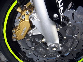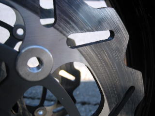 11:19 走行後のウエーブディスク。 このディスク、重量的にノーマルと同じと言うことですが、走り出してのハンドリングはジャイロ効果もあってか、少し重く切れにくくなった様に感じられました。 ただ、CBRに乗るのは、半年ぶりですから、以前のハンドリングを覚えているかと言うと、はっきり断言は出来ません。 普段街乗りでGSX-R1000を使っている自分としては、今までCBRのハンドリングは軽すぎに感じましたが、若干落着きを持ったようで、扱いやすくなったと思います。 |