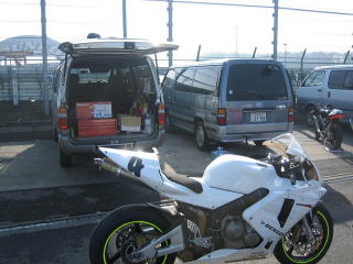 8:56 サーキットでのCBR。 プロダクションと言えども、レース車、立姿はサーキットが似合います。 今日の練習走行も1人で参加なので、当然、走行中の写真は写せません。 |