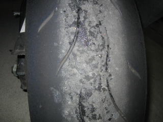昨年の12月9,393kmで交換したリヤタイヤは、もうすでにスリップサインが出ています。 冬場の走行で、しかもサーキットなし、ツーリングだけで2,162km! ライフが短すぎます。(T_T) |