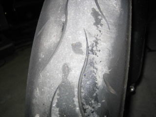 こちらは、フロントタイヤ。 まだ溝がありますが、美味しいところは終了。 タイヤの銘柄も換えるので、前後一緒に交換します。 フロントは6,377kmで交換したので、5,178km。まだ溝は残っていますので、ハイグリップタイヤとしてはライフは十分だと思います。 |