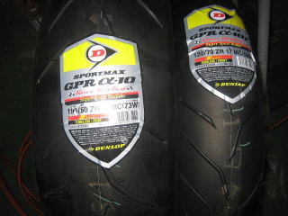 と言うことで、前後タイヤを交換します。 タイヤはダンロップのSPORTMAX α10、前後とも標準サイズです。 空気圧はツーリング使用と言うことで、前後2.5kgとしました。 |