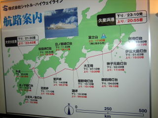 今日の航路 昨晩、横須賀を23:10に出航したフェリーは、22時間あまりをかけ、大分の大在港へ21:30に到着します。 |