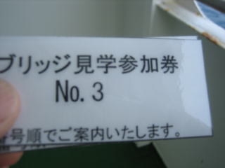 11:20 ブリッジ見学? 朝食後、惰眠をむさぼっていると、「ブリッジ見学を行います。見学希望者の方は参加券を配布しますので取りにきてください」との船内放送がありました。 どうせフェリーの中ではやることがなく退屈です。 早速、”ブリッジ見学参加券”なぞ言うものをゲットしてきました。 |