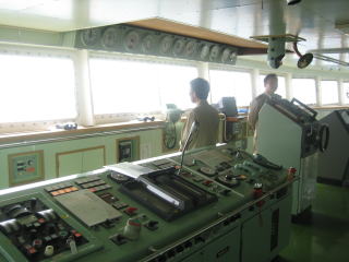 15:21 ブリッジ見学! 午後3時過ぎからは、午前中アナウンスのあったブリッジ見学です。 ブリッジと言うのは船の運転室で、そこを見学させてくれる訳ですね。 ゴールデンウイーク中のサービスだと思いますが、退屈な我々にはなかなか心憎いサービスです。 ちなみに、右端にある丸いのが、舵=船のハンドルですね。(それくらいは誰でも知っちょる!) でも、運転手も居なければ、イスもない。(只今、自動航行中です) |