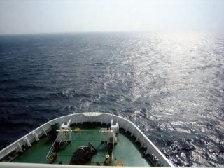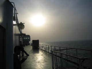 7:38 夜が明けると フェリーは太平洋のど真ん中。 陸地はおろか、辺りに船さえも見えません。 (この時間、フェリーは三重県沖を航行中です) |