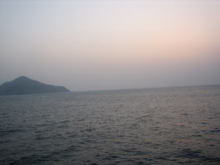 18:49 日没間際 7時も近くなり、日没間際の時間になりました。 春先で湿気が多いため、空気がよどみ、はっきりとした日没にはならず、ぼんやりとそしてゆっくりと空が暗くなっていきます。 日没時間は関東より1時間以上遅い感じです。 船は”沖の島灯台”沖を通過し、北に進路を取り、豊後水道そして大分を目指します。 |