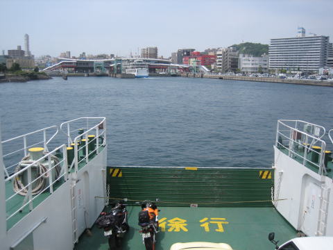 11:14 桜島フェリー 桜島からはフェリーで鹿児島市内へ向かいます。 桜島から鹿児島市内までは約3km、目と鼻の先、時間にして約20分になります。 このフェリー良く見ればわかりますが、バイクを載せてもロープなどで拘束しません。 サイドスタンドのみ、波の穏やかな錦江湾では、これでOKみたいです。 ちなみに、乗船時間が短いので四輪車は乗車したままで着岸を待っている人もいます。 フェリー代はバイク410円、人150円の合計560円也。 |