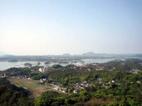 16:32 千厳山 渋滞の後ろに付き、脇をすり抜け、天草上島に入りました。 ここで、ビューポイントの”千厳山”に上り、今来た宇土半島の方角に目をやると、天草五橋に天草松島が眼下に広がります。 |