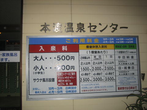 19:56 温泉だぁ ホテルの人に近くにある温泉を聞いて行ってみました。 ホテルのある下島から橋を渡った上島にある”本渡温泉センター”。 普通にバイクで5分くらい。 温泉はアルカリ成分が強いらしく、何となくヌルヌルしてます。 お湯自体がヌルヌルしているのではなく、湯船の中で自分の体を触るとヌルヌル、ヌルヌル、ついでにお湯はぬるめで、なんかさっぱりしません。 温泉なのは確かに間違いないのだが、さっぱりしたいなぁ。 |