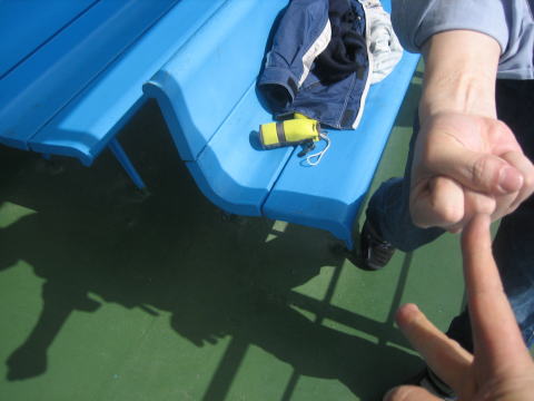 9:39 フェリーに乗れば フェリーに乗れば、ちょうどいい休憩時間ができます。 なにが、ちょうど良いかと言えば、ジュースジャンケン。 ※ 結果はご存じ、裏の写真で! |