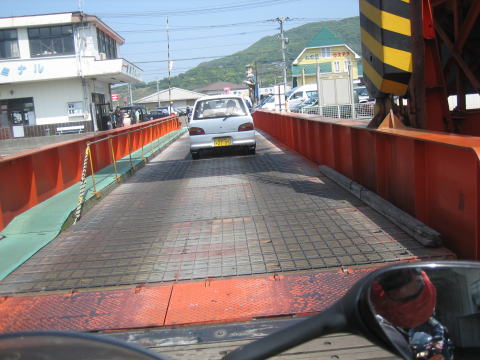 9:31 鬼池港に到着 天草下島の鬼池港に到着しました。 ここから、フェリーに乗って長崎県南島原市の口之津(くちのつ)港に向かいます。 鬼池−口之津間は1時間に1本の割合で出ている島鉄フェリーで30分。 料金は750cc以上920円+旅客運賃360円の1,280円です。 ゴールデンウイーク中、このフェリーは混むので四輪車の場合、2、3本待つことがあるそうですが、バイクの場合は、フェリーの隅っこの空いたスペースに載せるため、待ちはないようです。 (ただし、空きスペースに載せる関係上、一番最初に乗船し、下船は一番後になります) |