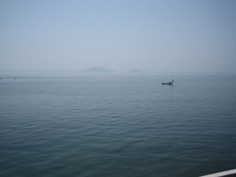 10:51 右手には島原湾 左手には雲仙普賢岳、その反対側に目をやると、内海である穏やかな島原湾を見ることができます。 遠くには昨日走ってきた宇土半島が春霞の中にうっすらと浮かんでいます。 |
