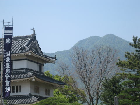 11:11 島原城と眉山 島原城西の櫓(やぐら)と眉山。 写真に写る山は、右から七面山、眉山、天狗山の三峰からなる連山。 その背後には、雲仙普賢岳が隠れている。 |