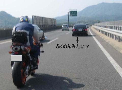 15:14 追跡 先にSAを出た、Ryo@Mさんを追いかけます。 高速道路上500mほど先にRyo@MさんのCBR1000RRを発見、追いつきました。 気付かれないように、他の車の陰に隠れ、じわじわと近づきます。 ちょっと、びっくりさせようと、アクセル全開。 Ryo@Mの側面をふわわキロoverですり抜け、前に出て、前を走る黒いセダンも追い抜こうとする。 と、リヤウインドウ越しの室内には助手席側にもルームミラーが。 覆面だぁぁ! フルブレーキング。 なんとか、追い越さずにすみました。 おとがめなし。あぶないあぶない。(^^;) 事前に気付いていたRyo@Mさんはヘルメットの中で大笑い。(^^) |