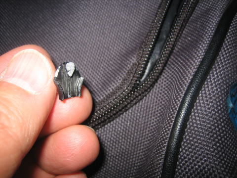 9:43 あっ! 出発のため荷造をして、バックのファスナーを閉めていると・・・ ポロッ。 あっ! ファスナーの金具が折れちゃいました。 まあ、反対側にも金具があるダブルファスナーなので、取りあえずは大丈夫ですが・・・(^_^;) |
