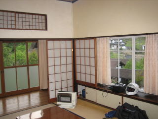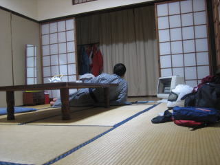18:08 部屋 さっそく部屋に案内されました。 部屋、ひろっ! 12畳+4畳ほどの板の間があります。 1人だと完全にもてあまします。 トイレは共同です・・・。やっぱホテルじゃなくて、旅館でしょ。 (別に共同トイレがイヤと言うわけではありませぬ) 宿泊費はお一人8千円〜あるそうですが、今回は税込み¥10,500-にしました。 でも、窓を閉める鍵がねじ込み式だったのが妙に懐かしかった。 |