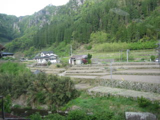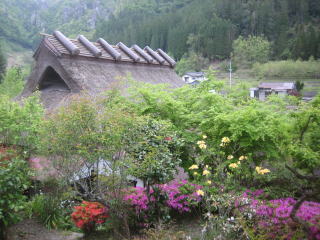 18:19 窓から 部屋の窓からは、手前に花壇、萱葺き屋根の向こうには耶馬溪の山々にあり奇岩を眺めることができます。 ちなみに、隣の部屋の会話は丸聞こえです。 |