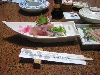 19:09 夕食です 夕食は部屋食です。 旅館の外観、中の整頓具合(かなり散らかっている?)から夕食はかなり期待薄でした。 と書くのですから、期待は裏切られるストーリーです。 まずは、鯉の洗いです。 泥臭さも変なクセも無く、味噌だれで美味しくいただけました。 (九州では意外に鯉を食べるんですよね) |