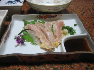 19:09 鳥刺しです 鳥の刺身です。表面を軽く炙ってありました。 これも、表面の締った感じと、中の生の感じがバランス良く美味しかったです。 その他に山菜、焼いた川魚(種類は忘れました)、茶碗蒸し、陶板焼きなど色々と十分出てきました。 |