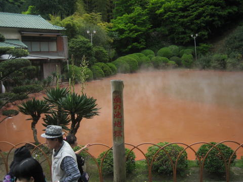 12:42 血の池地獄 別府市内にはこの”血の池地獄”をはじめ8箇所の地獄があるそうです。 血の池地獄はご覧の通り、お湯が真っ赤っか。 お湯に酸化鉄が溶け込んで、赤く見えるんですね。 (血液が赤く見えるのと同じですね) 入場料は1箇所あたり¥400-。 (8箇所全部行ける共通観覧券は¥2,000) 園内はきれいに清掃されてはいますが、1箇所づつ毎回¥400円を徴収するのは如何なものかなぁと思います。 特に、横から人が入れないようにするため土産屋で周辺を囲って、土産屋を通らないと、血の池地獄に入れないように配置したレイアウトには、商売気が見え見えで辟易とさせられます。 |