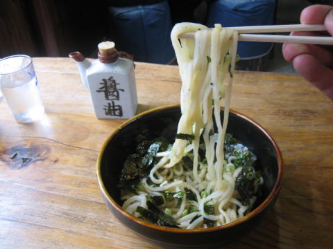 13:33 まずはうどん屋さんなのでうどんを食べてみないことには始まりません。 注文したのは、”ぶっかけ”。 やや細めの透明感のある手打ち(たぶん)麺です。 九州のちょい甘めの醤油をかけて食べます。 このうどんは旨いですねぇ。 つるつるとした歯ごたえと、もちもちした食感はうどんならではの物です。 シンプルなぶっかけで十分に麺の美味さを味わうことが出来ました。 ¥350-でさらに”◎” お薦めです! |