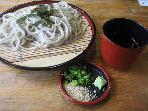 13:35 続いて、手打ち蕎麦です。 蕎麦粉十割と書いてありました。 さっそく、いただきます。 「・・・・」 ゴメンナサイ。ダメです。 蕎麦は本当に十割なんでしょうか? 残念ですが、蕎麦の香りがほとんど感じられませんでした。 汁も甘めで、出汁が弱く、関東の鰹出汁がきちっと効いた辛めの汁になれた自分には、ぼけて感じます。 ここの蕎麦をもって九州全体の蕎麦をどうこう言うつもりはありませんが、ここの蕎麦は関東人としてはお薦めできません。 うどんの方が10倍旨いです。 ちなみに、ざるそばは\700だったと思います。(-_-;) |