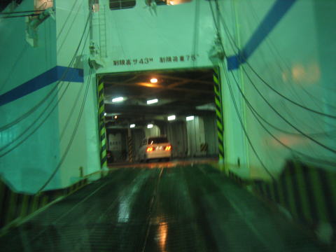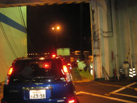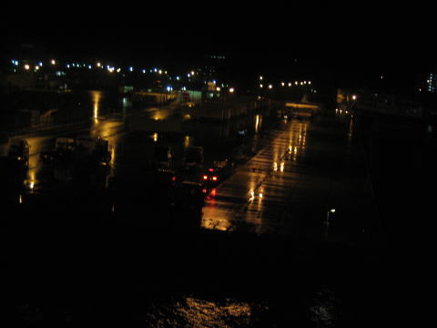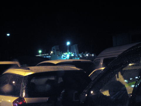 21:45 フェリー入港 夕食のあと、フェリー埠頭に戻り、乗船手続きをすませました。 10時少し前にフェリーが到着。 到着便の車が下船しだい、10時半頃から上船になります。 |