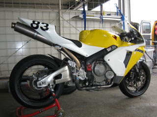 7:36 ツートンカラー 前回のモテギでの転倒で壊れてしまい、つぎはぎ状態のカウル 。 ツートンカラーになっています。 |