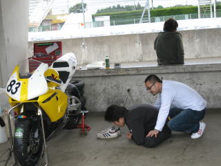 16:10 となりのピットでは となりのピットでは”レーシングサプライ觔斗雲&ビークラフト”から参戦している行方選手。 今日は優勝でした。 おめでとう! コシカワのエビスの走行会でリヤスライドをしながら1コーナーに入っていく、とっても器用な選手です。 |