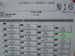 14:01 予選結果 予選結果が発表になりました。 1秒299、”0秒台”に入れることは出来ませんでしたが、8番手2列目に並ぶことが出来ました。 前回4月9日の東日本チャレンジカップの時の予選タイムが2秒3だったので、2ヶ月で約1秒タイムを縮めてきています。 |