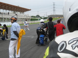 14:24 S80スタート進行 ST600のファイナルは3時20分から。 その前のクラスのS80のスタート進行が始まりました。 ピットレーンにはS80のレーサーが並びます。 ふと見ると、ヘルパーでノリックがいるではないですか! |