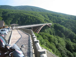 「アーチ支柱間255mは国内最長、谷底からの高さ122m」とツーリングマップルに書いてあったので、ちょっと寄り道をしました。