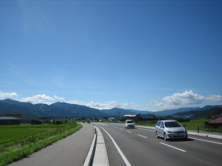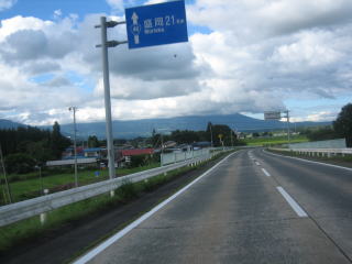 9:22 国道282号線から 国道282号線を盛岡方面に向けバイクを走らせます。 国道282号線もここ鹿角の市内の米代川に沿って走る道は平坦な直線が続きます。 直線のむこう側には、八幡平の山々が見えて来ました。 |