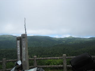 10:20 八幡平から なんて書いているうちに、八幡平山頂付近の見返峠付近まで来ました。 八幡平から秋田方面を眺めると見事な山海を望むことが出来ます。 この地形を見ると、なるほど”アスピーテ”ってこうゆう地形ね。とうなずけます。 さて、八幡平の頂上(標高1,613m)は車では行けないので、徒歩で行くしかありません。 当然、パス。 |