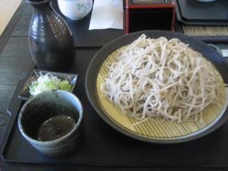 13:07 蕎麦 注文したのは”もりそば”の大盛り、¥980−なり 観光地と言うこともあり、あまり期待はしていなかったのですが、太めに打たれたその蕎麦は、以外にも(失礼)香りもあり美味しくいただけました。 ちなみに、左上に写っているお銚子らしき物は、お酒ではなく、蕎麦つゆです。(ハイ) |
