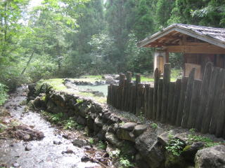 14:05 露店風呂 ご覧の様に露店風呂は野趣溢れる川沿い建っていました。 自分が到着するとちょうど入れ違いで、男女2人が出ていきました。 混浴ですね!(ちょっと期待) |