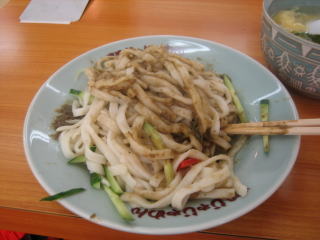 17:05 じゃじゃ麺 早速、注文をして出てきました”じゃじゃめん”。 テレビとか写真とかでは見たことはあるのですが、実物は初めて。 見た目は、細めの平打ちされた”うどん”っぽいです。 それに肉みそがのっていて、混ぜて食べます。 早速食べます。 なかなか美味しかった記憶があるのですが、(注:このレポを書いているのは、3ヶ月も後の11月)冷麺ほどのインパクトはありません。 やはり、全国区になるのは、ちょっと弱いと思いました。 |