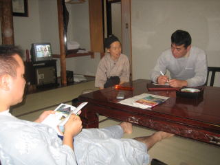 17:51 部屋で 早速部屋に案内され、宿帳に記帳。 たった今到着して記帳しているのに、すでに浴衣を着て湯上がり姿の・・・・ (座敷童の)すーさんです。 3時半には到着して、すっかりくつろいでいます。 |