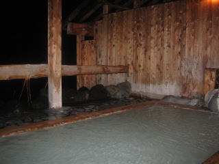 18:39 秘湯 早速、温泉に入りました。(*^_^*) 上の写真は露天、下はうち風呂です。 (他のお客さんがいなくなった隙に写真を撮らせていただきました) お湯は乳白色で、湯加減は熱くもなく、長湯ができるちょうど良い具合です。 |