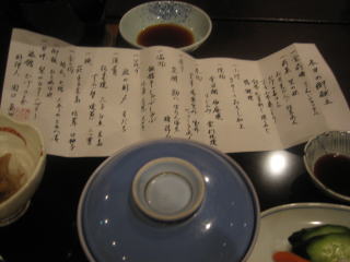 19:02 夕食です 夕食は懐石風で、前菜、小鉢から始まり、椀、御飯まで結構な量の食事が出てきます。 出てくる料理は、手が込んでいてどれも美味しいです。 下の写真の献立表は女将さんの手書きらしい。 |