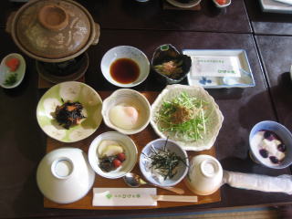 8:31 朝食です。 8時半になりました。 おまちどおさま、朝食です。 朝食は標準的な和食、左上の土鍋は12月末レポートを書いている今となっては??? みそ汁だったかな? 朝食もやはり、御飯は最高!美味しいです。 |